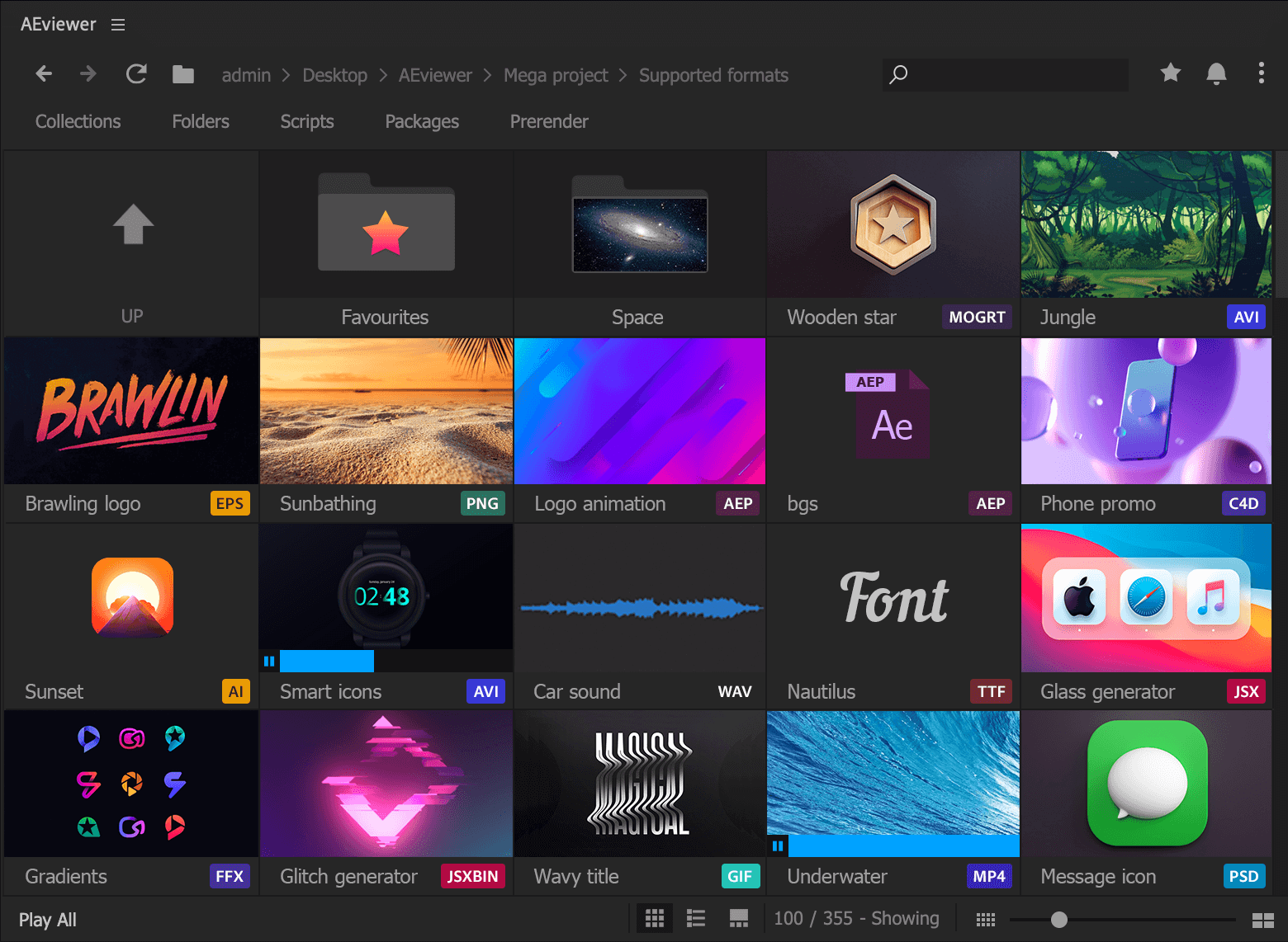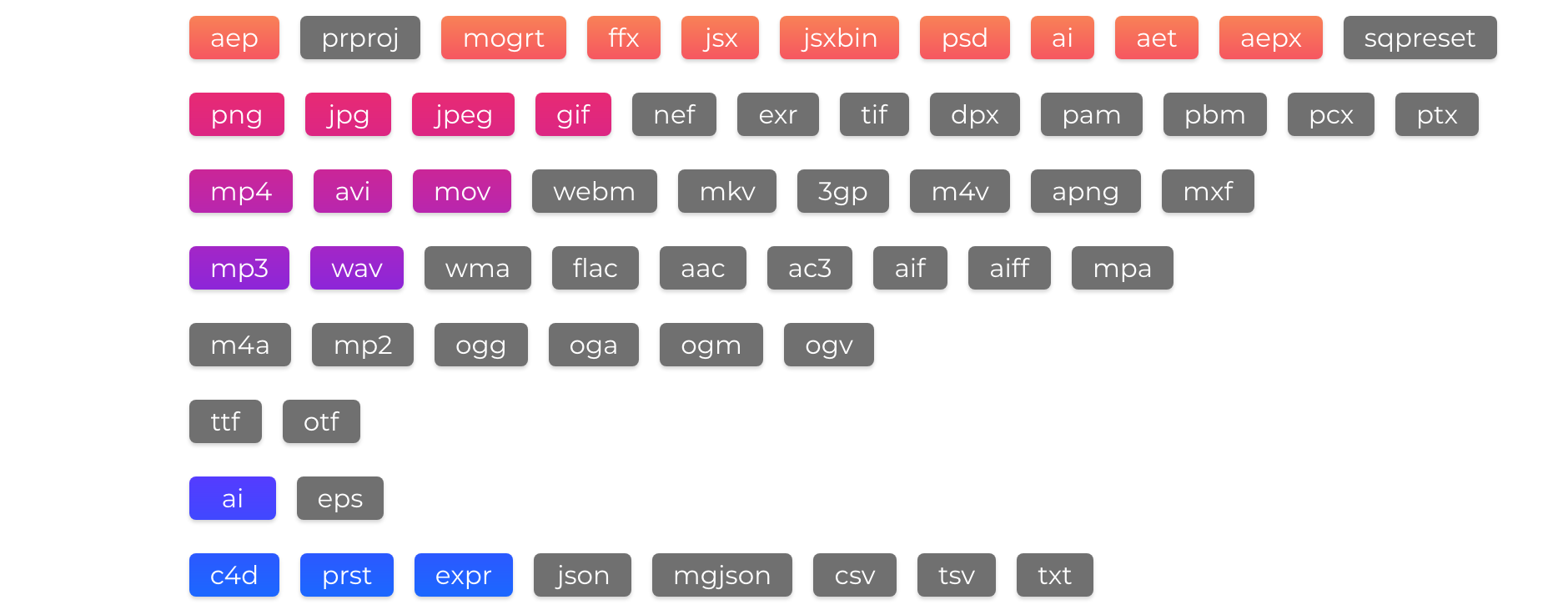 Preview and import AEP, MOGRT, FFX, C4D, PRPROJ, PSD, AI, AET, AEPX,WAV, MP3, MP4, AVI, MOV, PNG, JPEG, JPG, GIF