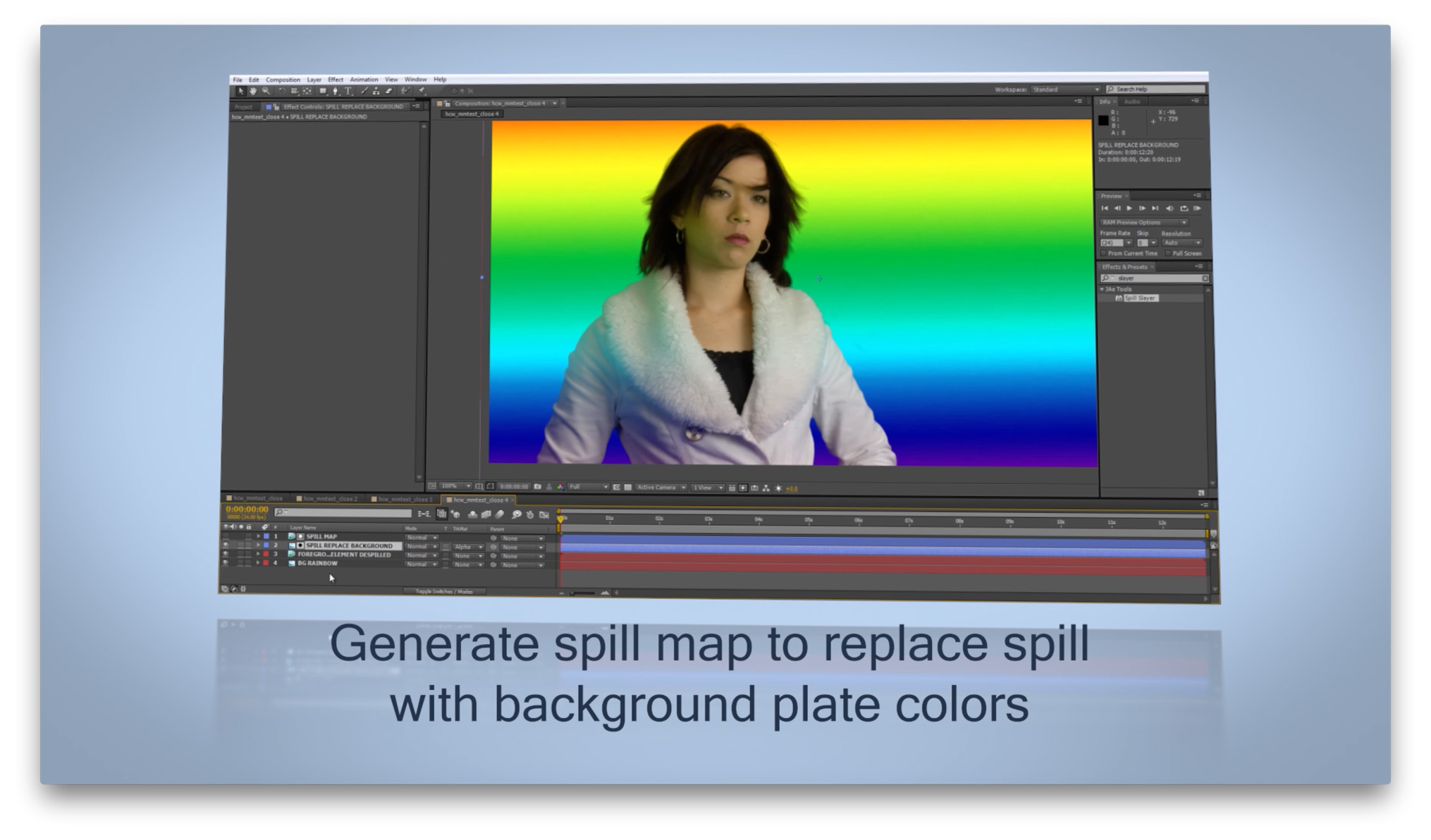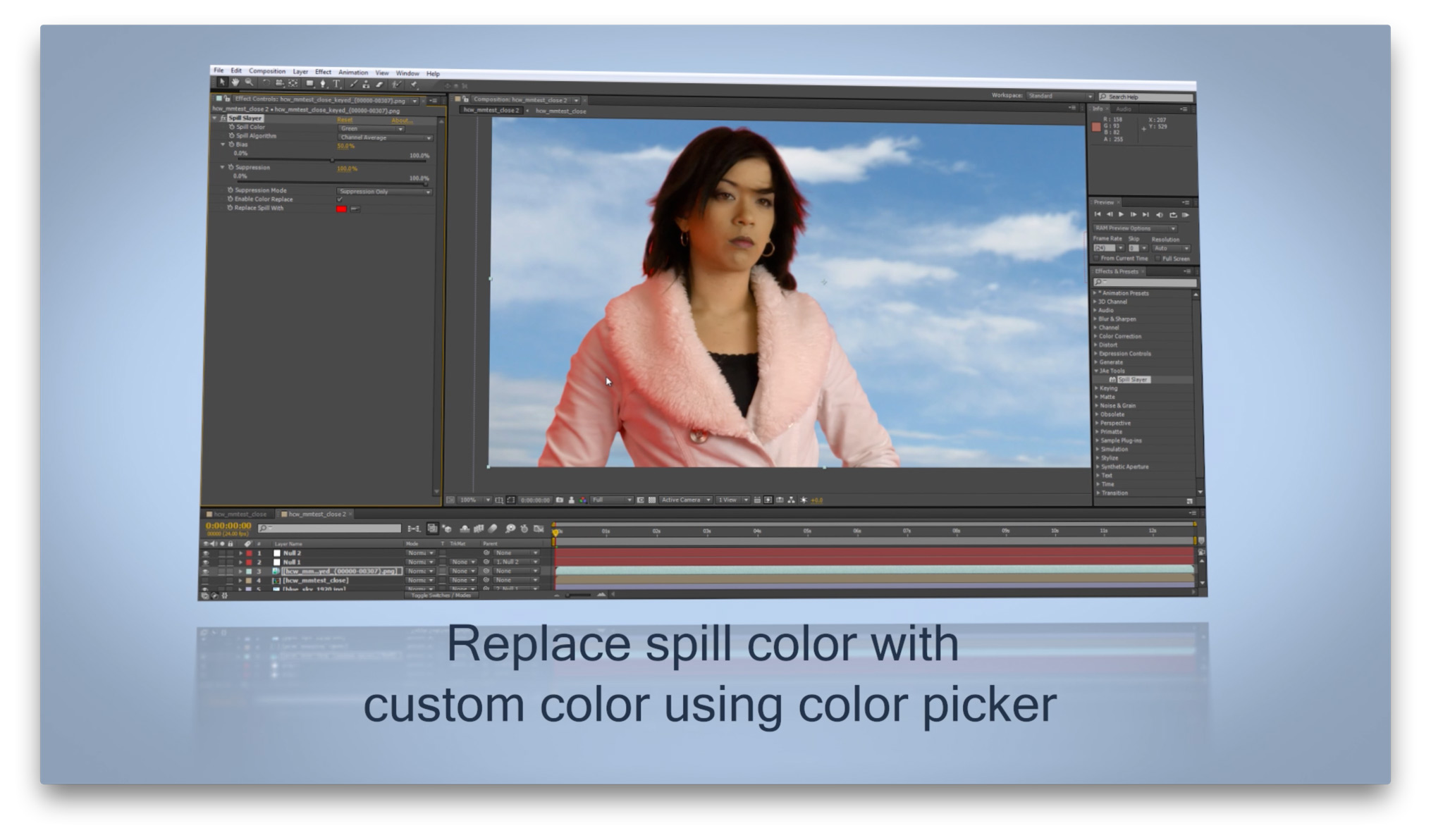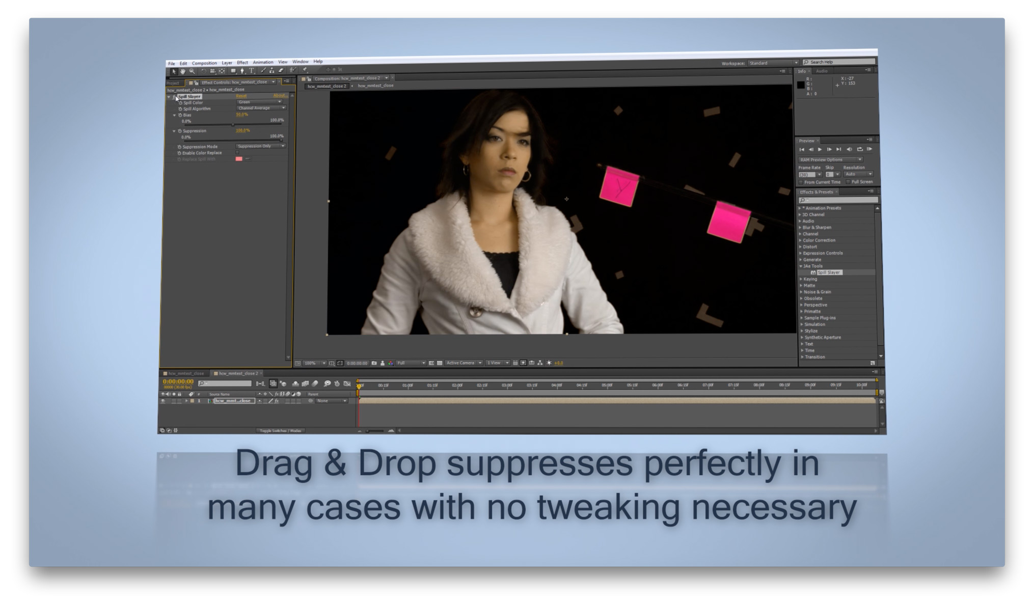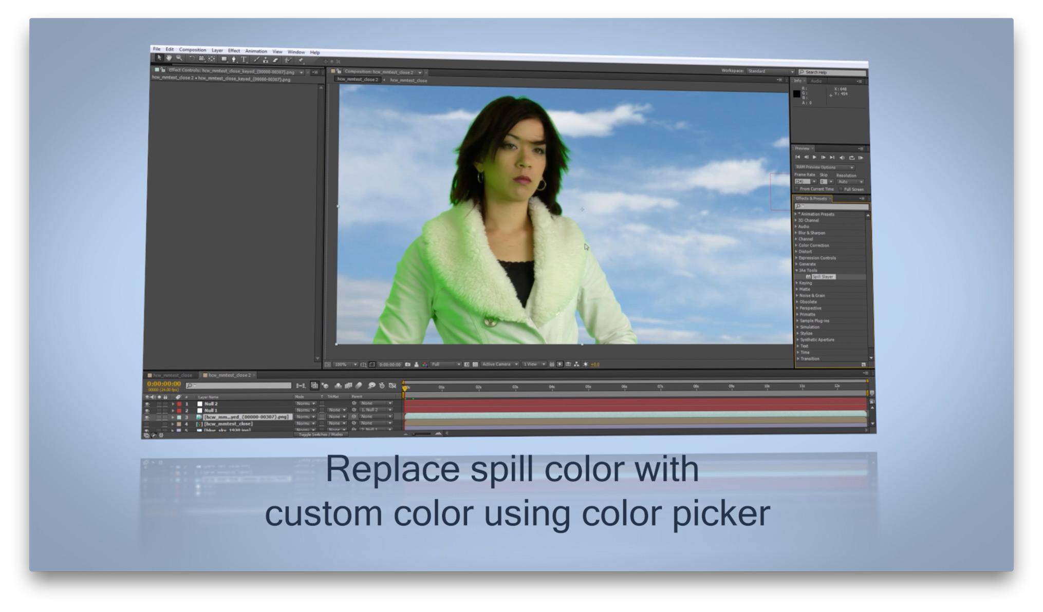 Use in conjunction with Keylight, Primatte, or any keyer as a fast, easy, and powerful spill replacement or assistant