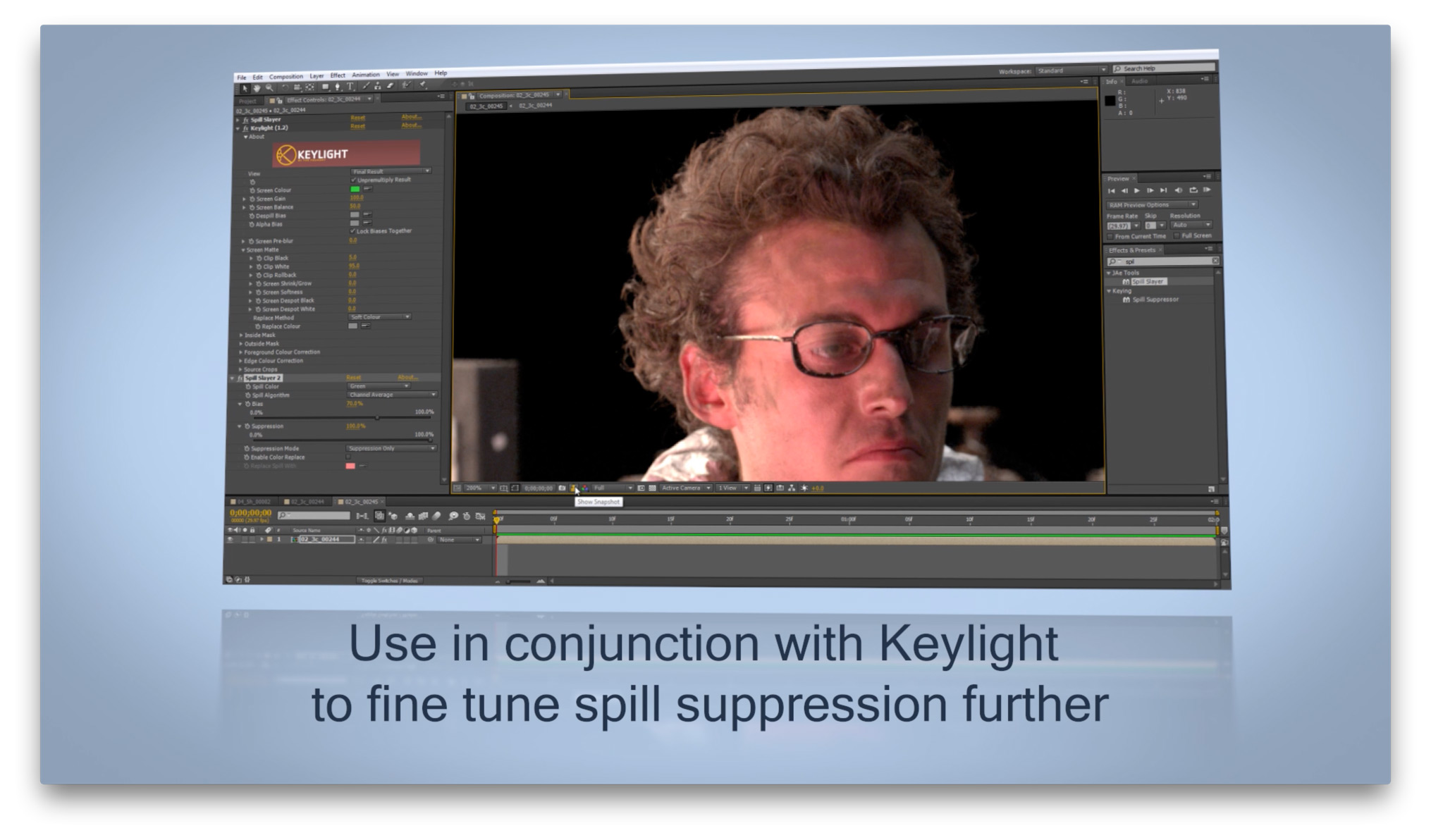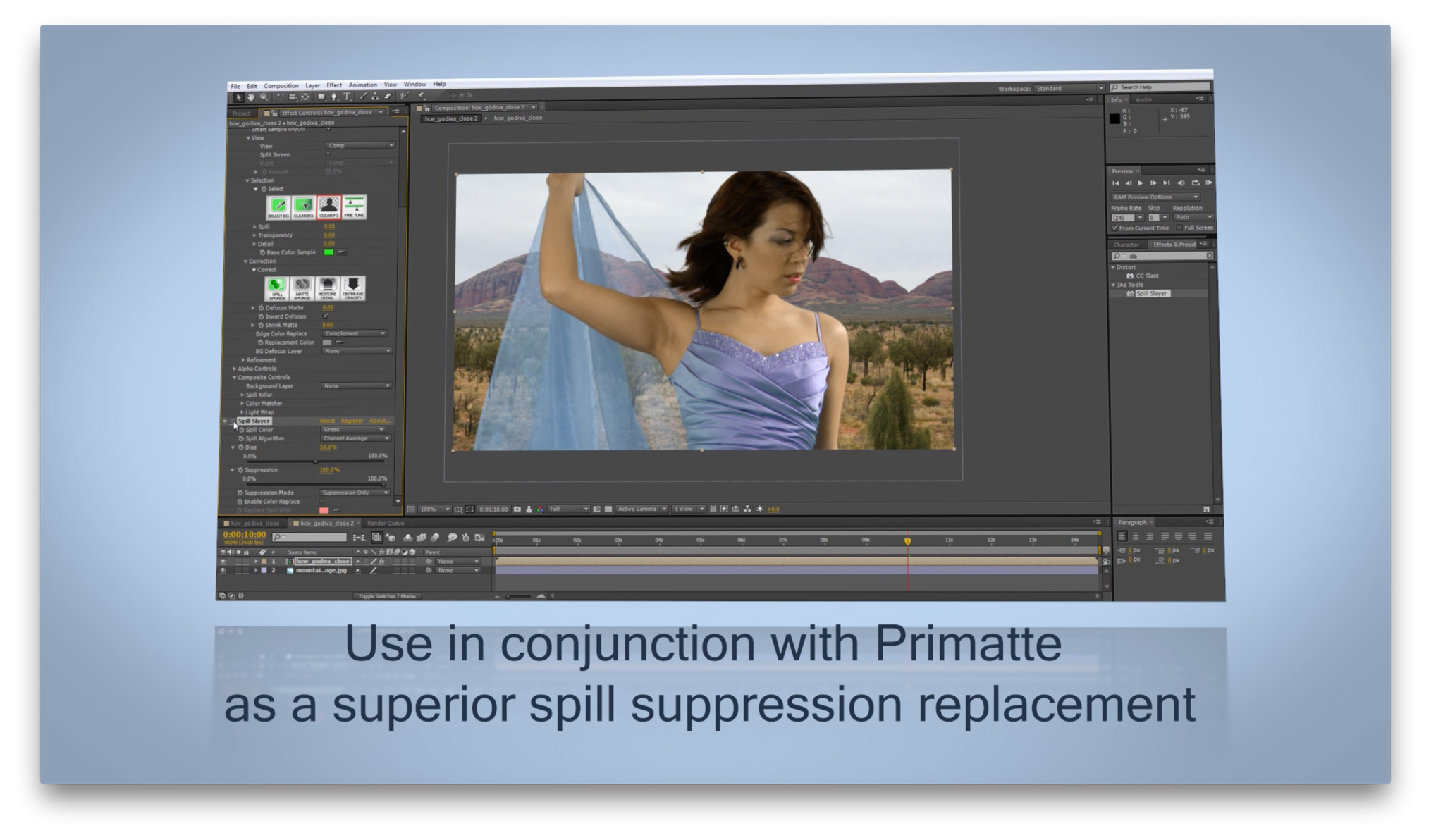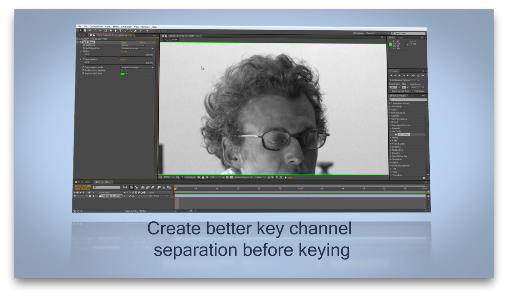 Spill Slayer is a sophisticated spill suppression tool for Adobe After Effects developed on industry proven methods and algorithms for handling spill in a professional environment. It is one of the only spill solutions available that supports 32-bit float color for high precision color correcting when compositing green/blue/redscreen material.